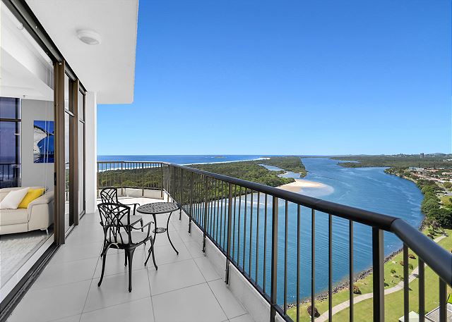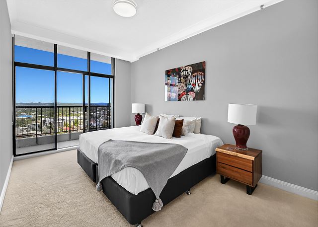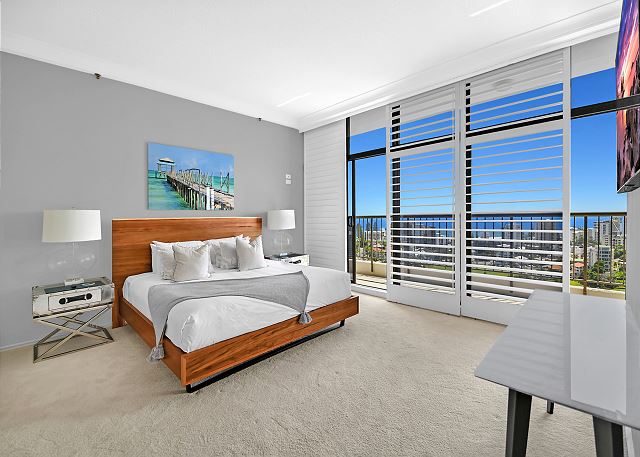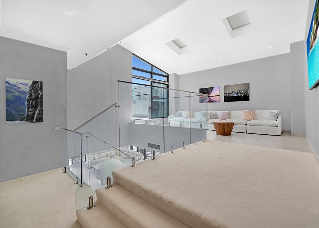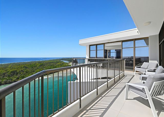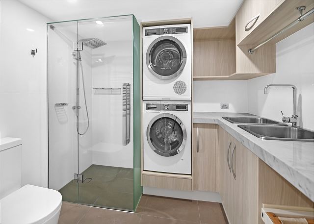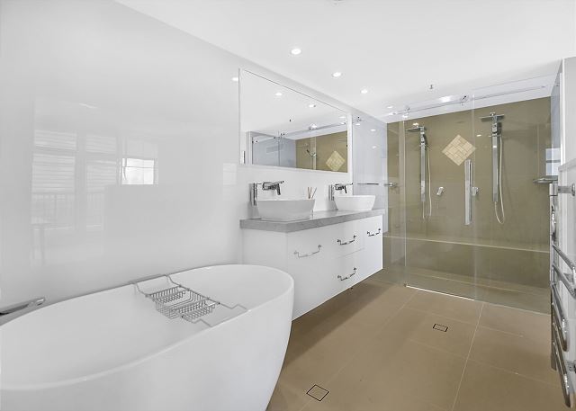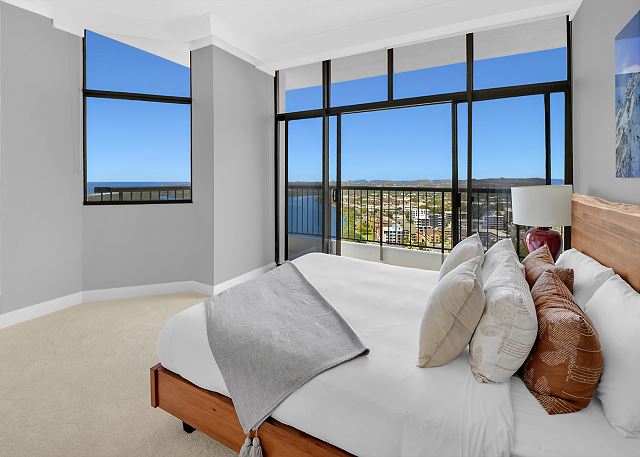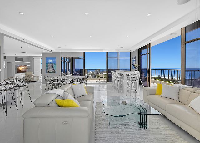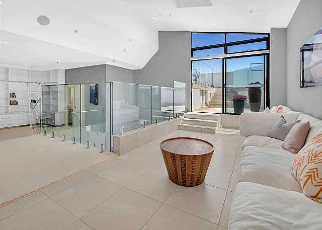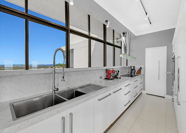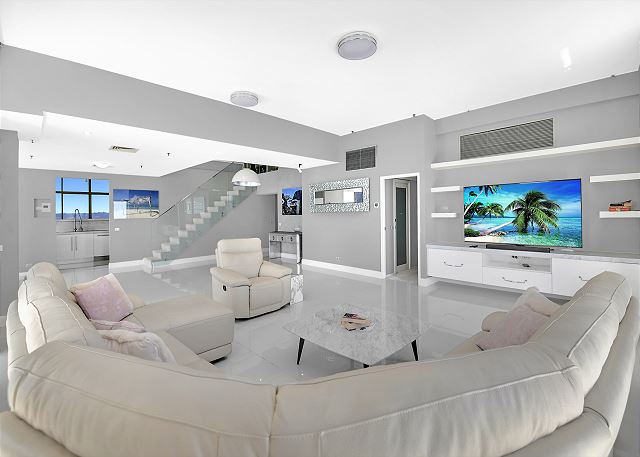 Spanning two levels, this expansive penthouse is designed for unparalleled comfort and luxury. The lower level boasts three elegantly appointed bedrooms, each perfectly positioned to capture breathtaking hinterland and water views. The master suite features a plush king bed, en-suite, and ducted air conditioning, while the second and third bedrooms offer queen, two king-single beds, and access to stylish bathrooms. The open-plan living and dining area is bathed in natural light, featuring high ceilings, plush seating for 16, and a sophisticated entertainment setup with Free-to-Air and Internet TV. A gourmet kitchen, complete with Carrara marble benchtops, Miele appliances, and an induction stovetop, caters to all culinary needs. The dining area seats 16, with an additional breakfast bar for casual meals. A standout feature of this home is the upper-level retreat, offering a charming library, private bar, and seamless access to the exclusive rooftop pool and entertainment deck. Complete with a gas BBQ and outdoor seating, this private oasis is the perfect setting for soaking up panoramic ocean views. Guests can also enjoy access to the building’s resort-style pool and tennis courts.
